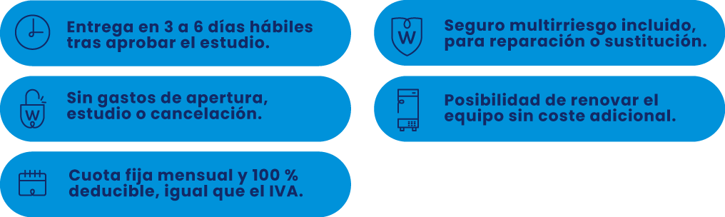 El renting os permite disfrutar de un equipo nuevo desde el primer día, con plazos de 1 a 6 años y sin pago inicial.Entrega dentro de vuestro local: un servicio premium que nos distingue.